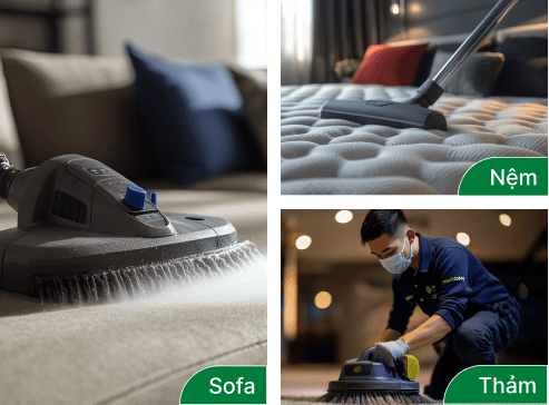 Dịch vụ giặt sofa chuyên nghiệp cho mọi chất liệu từ vải, da, nỉ đến nhung, đảm bảo sử dụng hóa chất an toàn, quy trình hiện đại, giúp sofa sạch như mới.